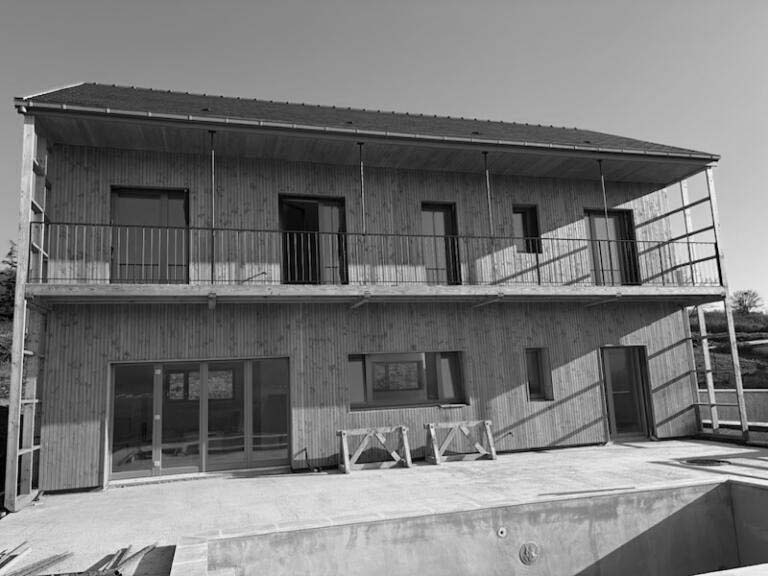 Structure en béton cellulaire. Charpente en fermettes avec couverture en tuiles. Ossature bois, murs ossature bois, isolation laine de bois et bardage bois sur la façade ouest.